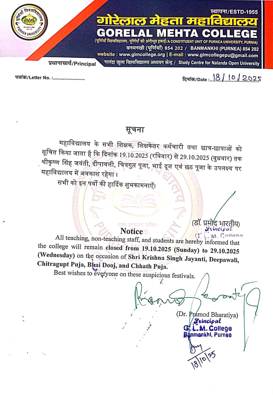आपका स्वागत करता हूं। गोरेलाल मेहता कॉलेजके प्रिंसिपल के रुप में, मैं आपको उस जीवंत शिक्षण समुदाय से परिचित कराते हुए सम्मानित महसूस कर रहा हूं जो आपका इंतजार कर रहा है। शिवाजी में, हम मानते हैं कि शिक्षा व्यक्तिगत विकास, व्यवसायिक सफलता और सामाजिक उन्नति की नींव है। हमारी संस्था के पास अकादमिक उत्कृष्टता का एक समुद्ध इतिहास है, जिसने अनगिनत व्यक्तियों के जीवन को आकार दिया है और जिन्होंने विभिन्न क्षेत्रों में सकारात्मक प्रभाव डाला है।